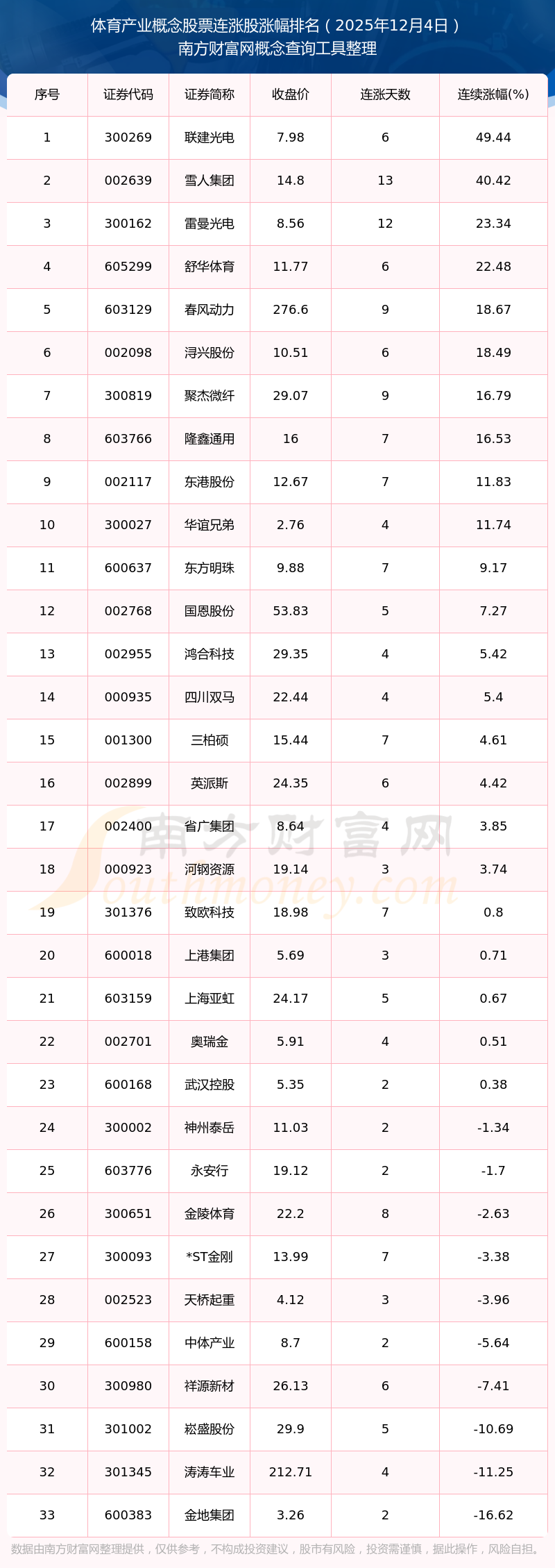 2025年12月4日体育产业概念股票连涨股涨幅排名