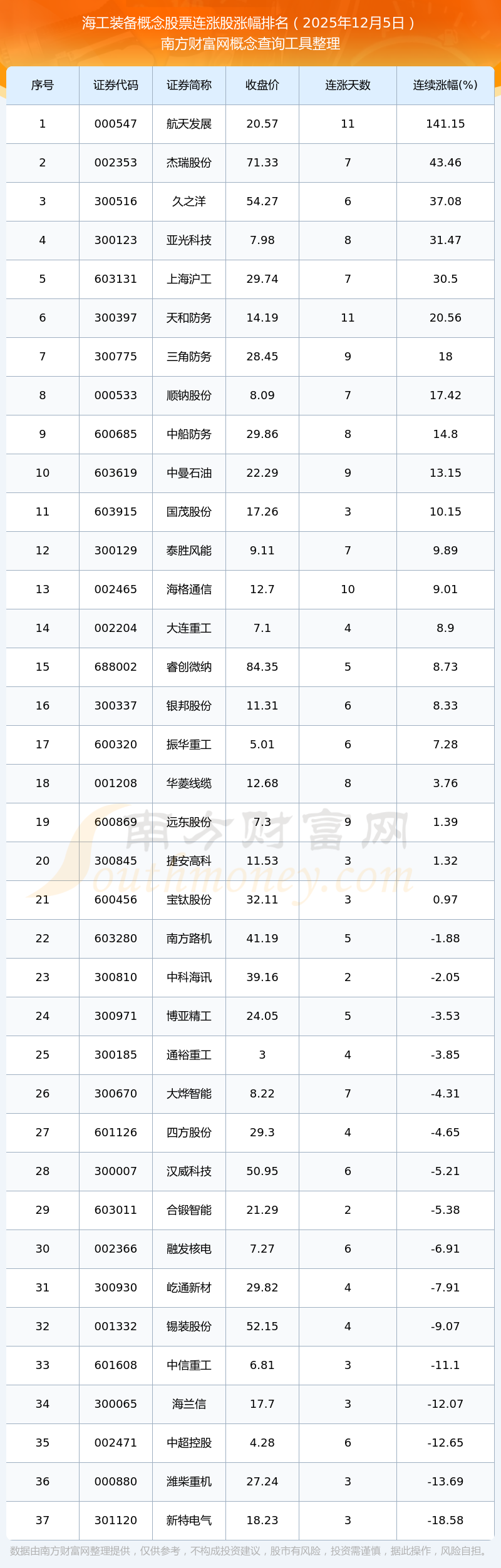 根据南方财富网概念查询工具数据统计,截止2025年12月5日收盘,海工装备概念股票共有37只个股实现连涨。其中连续涨幅较大的个股有航天发展、杰瑞股份、久之洋等,连续涨幅分别为141.15%、43.46%、37.08%。