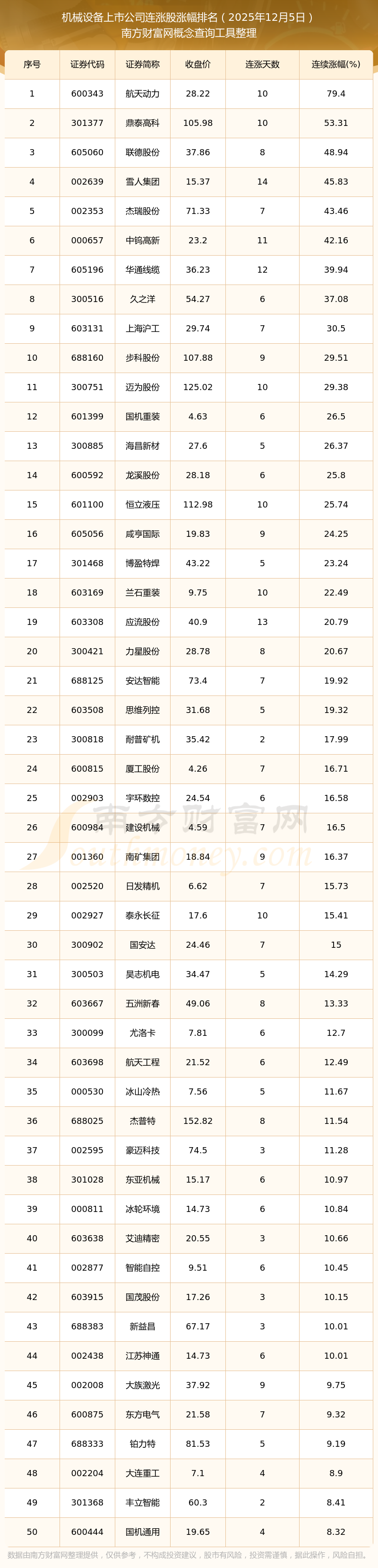2025年12月5日机械设备上市公司连涨股涨幅排名