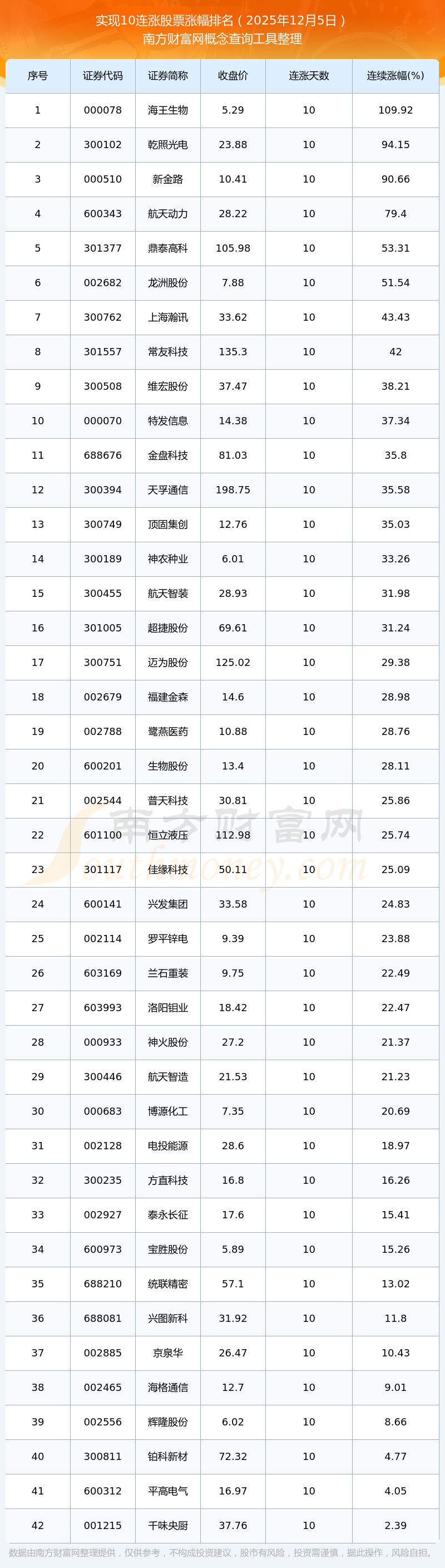 根据南方财富网概念查询工具数据统计,截止2025年12月5日收盘,共有42只个股实现10天连涨。其中连续涨幅较大的个股有海王生物、乾照光电、新金路等,连续涨幅分别为109.92%、94.15%、90.66%。