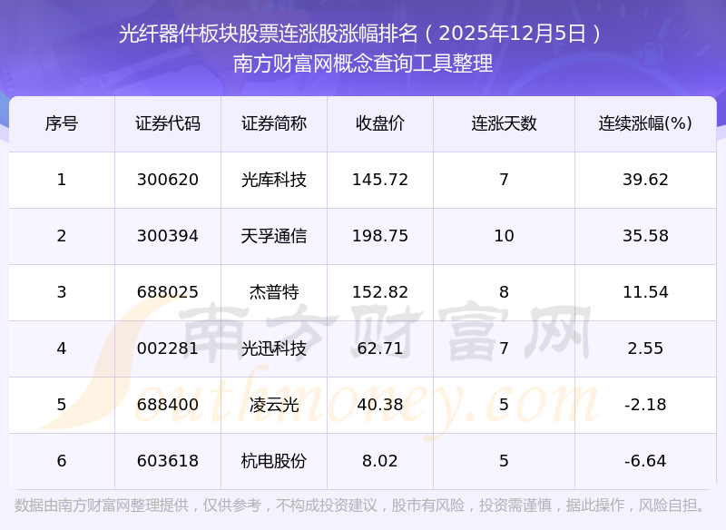 2025年12月5日光纤器件板块股票连涨股涨幅排名