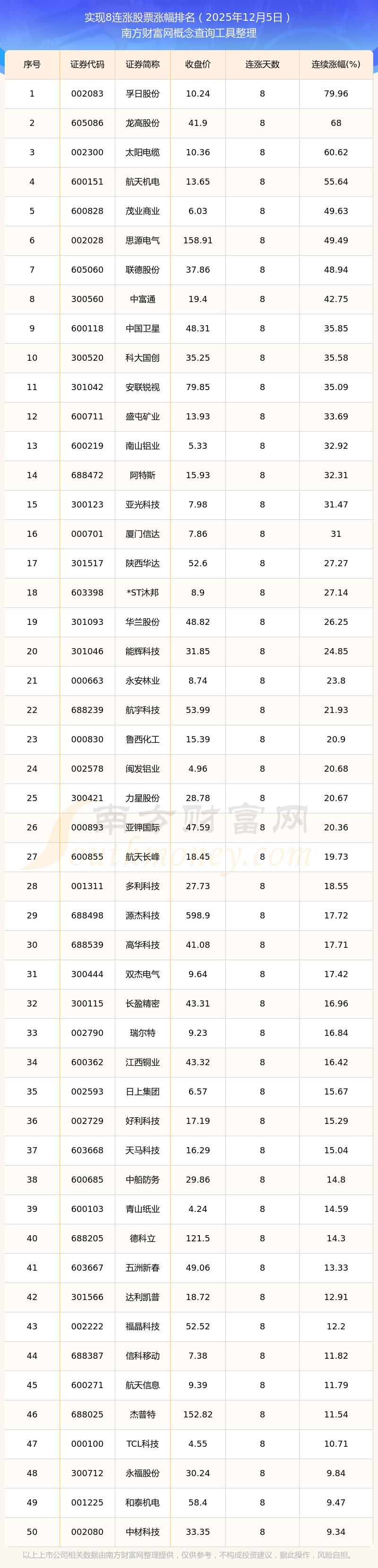 根据南方财富网概念查询工具数据统计,截止2025年12月5日收盘,共有75只个股实现8天连涨。其中连续涨幅较大的个股有孚日股份、龙高股份、太阳电缆等,连续涨幅分别为79.96%、68.00%、60.62%。