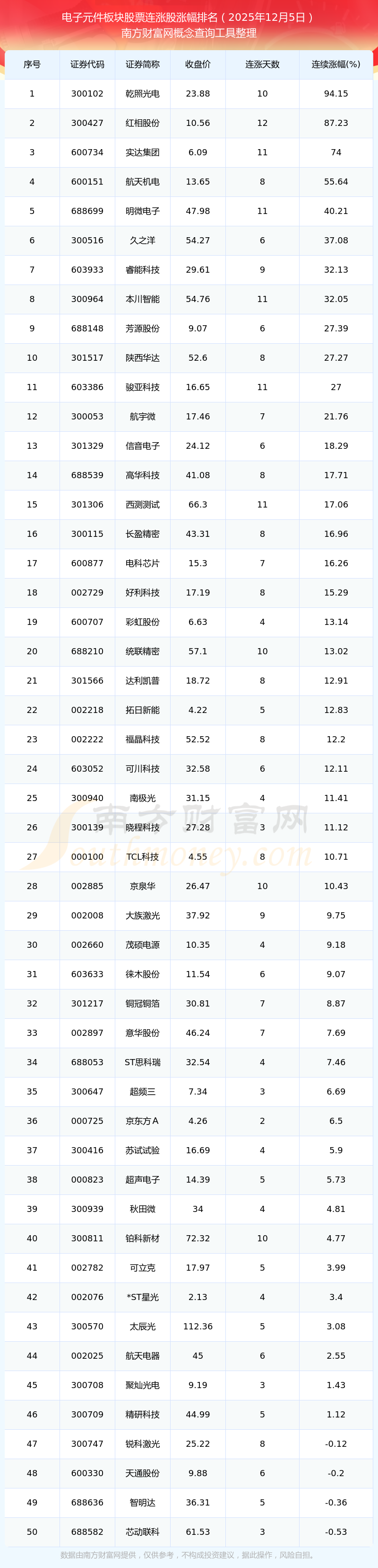 2025年12月5日电子元件板块股票连涨股涨幅排名