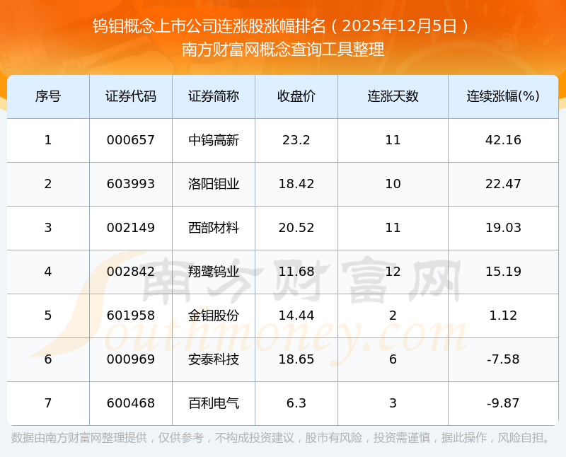 根据南方财富网概念查询工具数据统计,截止2025年12月5日收盘,钨钼概念上市公司共有7只个股实现连涨。其中连续涨幅较大的个股有中钨高新、洛阳钼业、西部材料等,连续涨幅分别为42.16%、22.47%、19.03%。