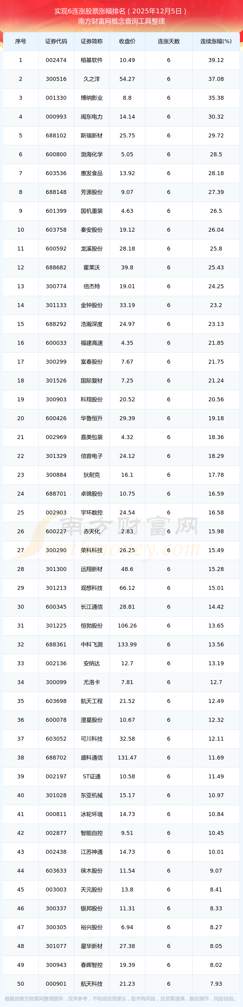 根据南方财富网概念查询工具数据统计,截止2025年12月5日收盘,共有106只个股实现6天连涨。其中连续涨幅较大的个股有榕基软件、久之洋、博纳影业等,连续涨幅分别为39.12%、37.08%、35.38%。