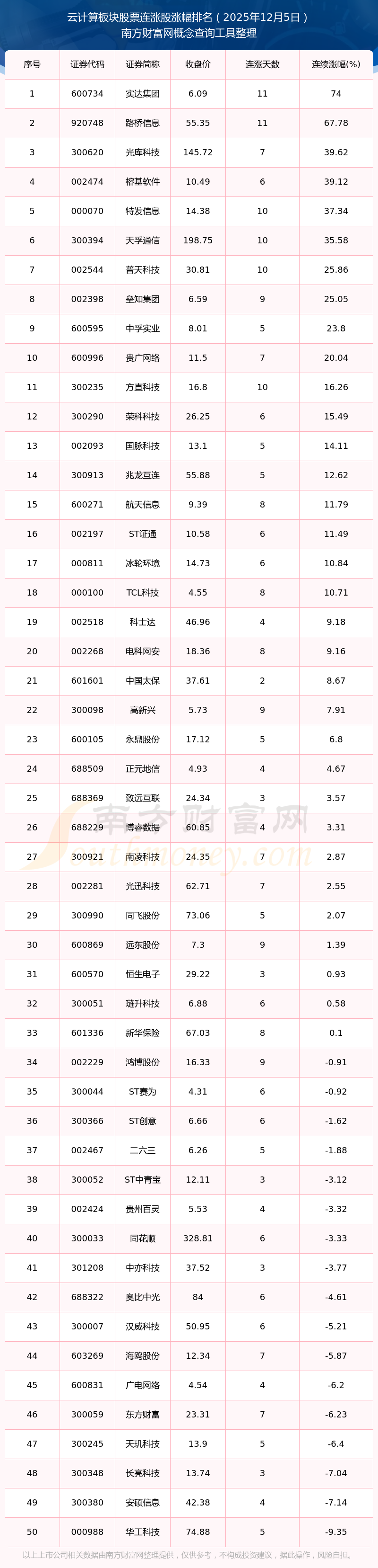 2025年12月5日云计算板块股票连涨股票涨幅排名