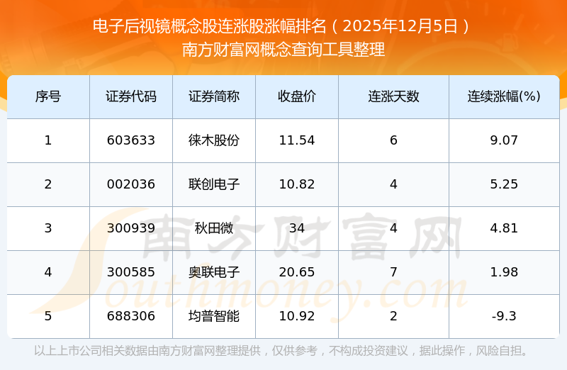 2025年12月5日电子后视镜概念股连涨股涨幅排名