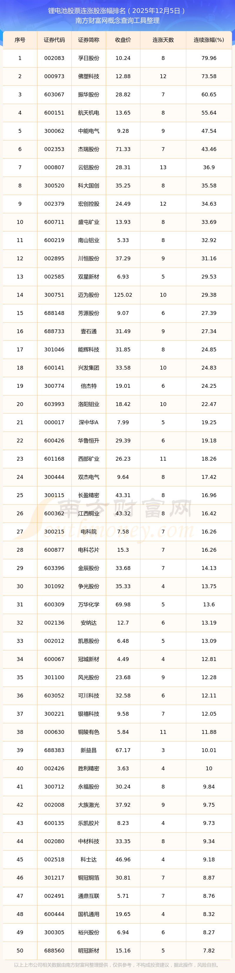 根据南方财富网概念查询工具数据统计,截止2025年12月5日收盘,锂电池股票共有100只个股实现连涨。其中连续涨幅较大的个股有孚日股份、佛塑科技、振华股份等,连续涨幅分别为79.96%、73.58%、60.65%。