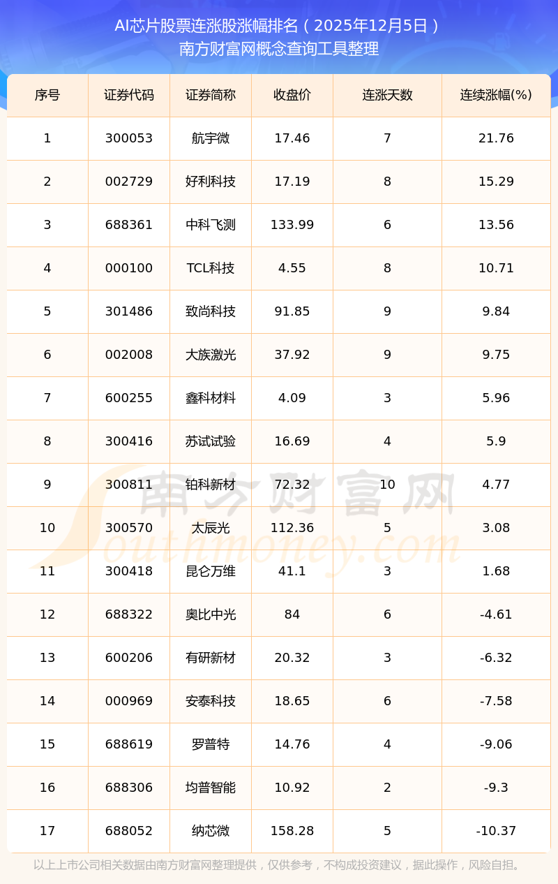 根据南方财富网概念查询工具数据统计,截止2025年12月5日收盘,AI芯片股票共有17只个股实现连涨。其中连续涨幅较大的个股有航宇微、好利科技、中科飞测等,连续涨幅分别为21.76%、15.29%、13.56%。
