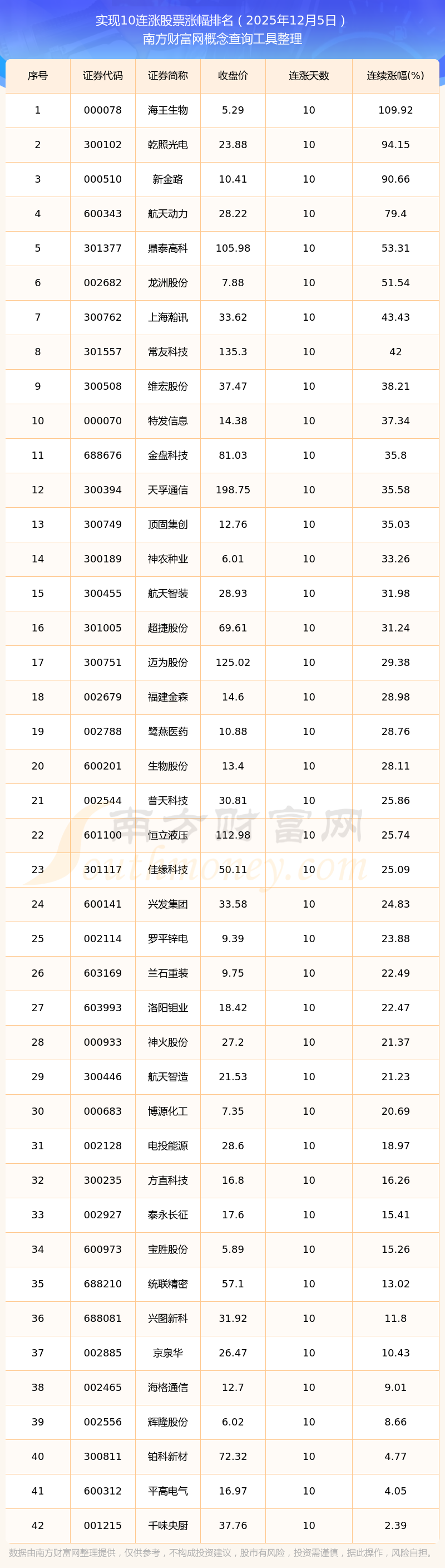 根据南方财富网概念查询工具数据统计,截止2025年12月5日收盘,共有42只个股实现10天连涨。其中连续涨幅较大的个股有海王生物、乾照光电、新金路等,连续涨幅分别为109.92%、94.15%、90.66%。