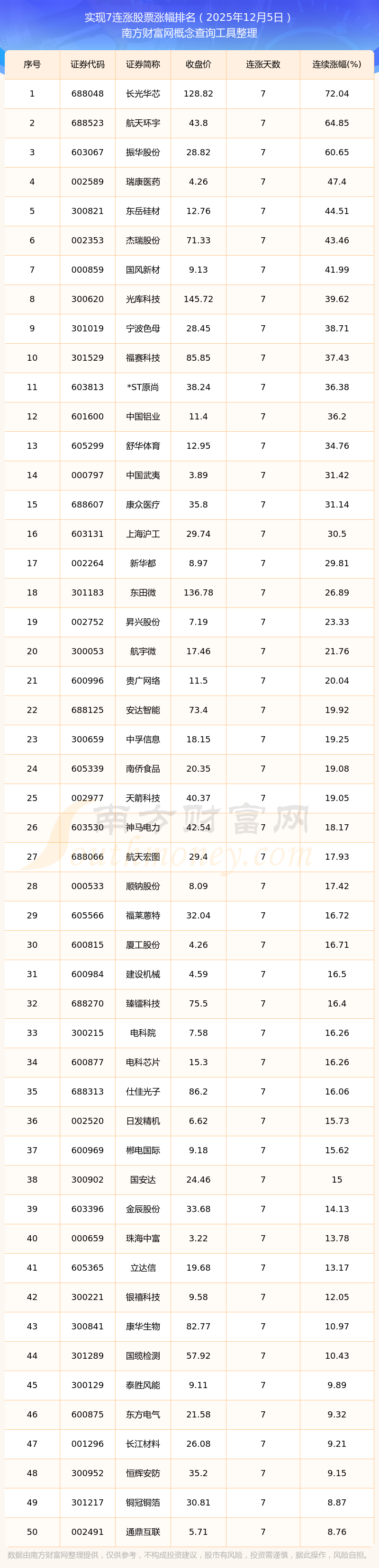 根据南方财富网概念查询工具数据统计,截止2025年12月5日收盘,共有86只个股实现7天连涨。其中连续涨幅较大的个股有长光华芯、航天环宇、振华股份等,连续涨幅分别为72.04%、64.85%、60.65%。