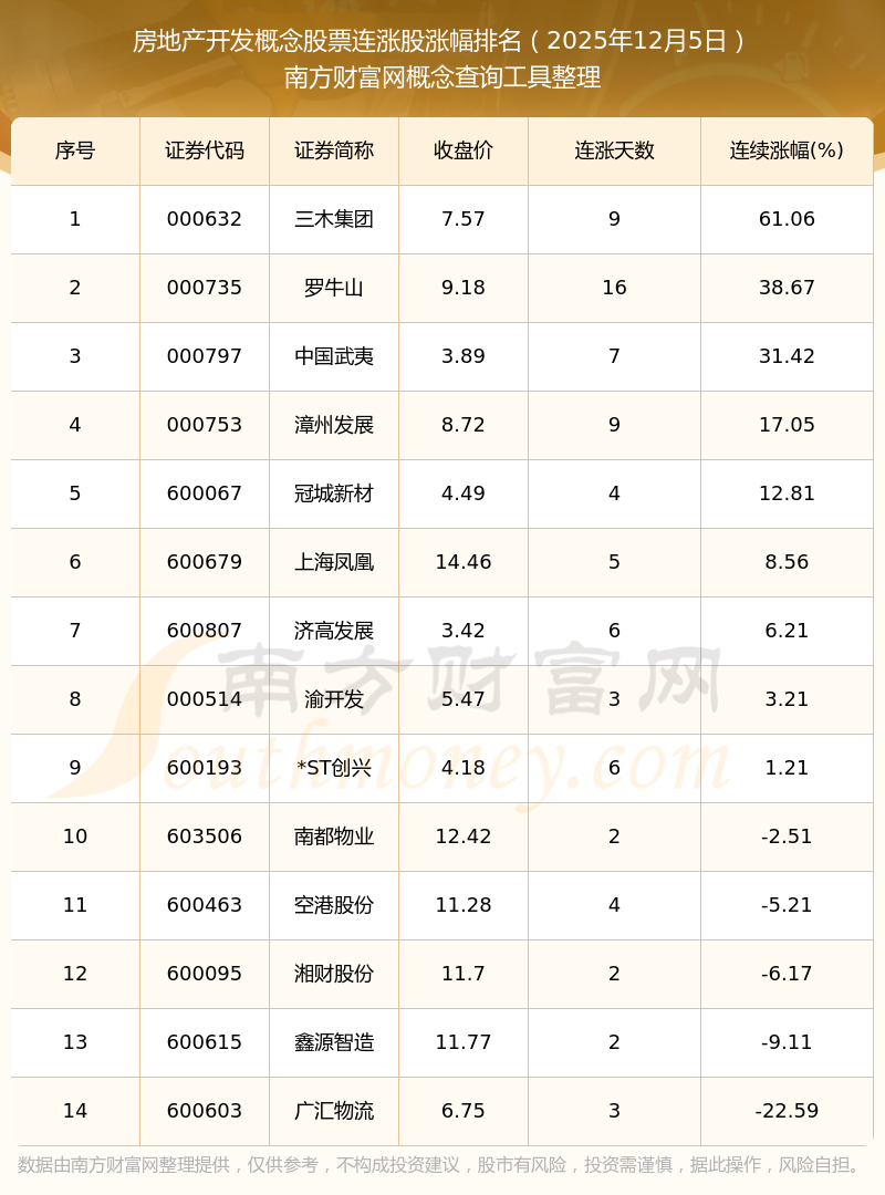 根据南方财富网概念查询工具数据统计,截止2025年12月5日收盘,房地产开发概念股票共有14只个股实现连涨。其中连续涨幅较大的个股有三木集团、罗牛山、中国武夷等,连续涨幅分别为61.06%、38.67%、31.42%。