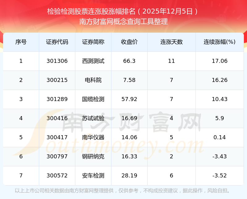 根据南方财富网概念查询工具数据统计,截止2025年12月5日收盘,检验检测股票共有7只个股实现连涨。其中连续涨幅较大的个股有西测测试、电科院、国缆检测等,连续涨幅分别为17.06%、16.26%、10.43%。