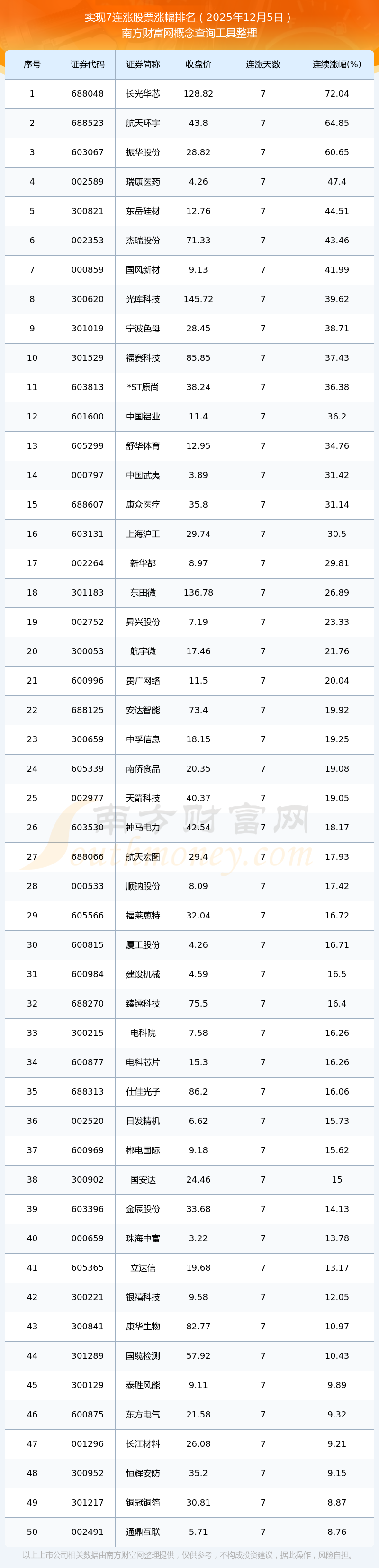 根据南方财富网概念查询工具数据统计,截止2025年12月5日收盘,共有86只个股实现7天连涨。其中连续涨幅较大的个股有长光华芯、航天环宇、振华股份等,连续涨幅分别为72.04%、64.85%、60.65%。
