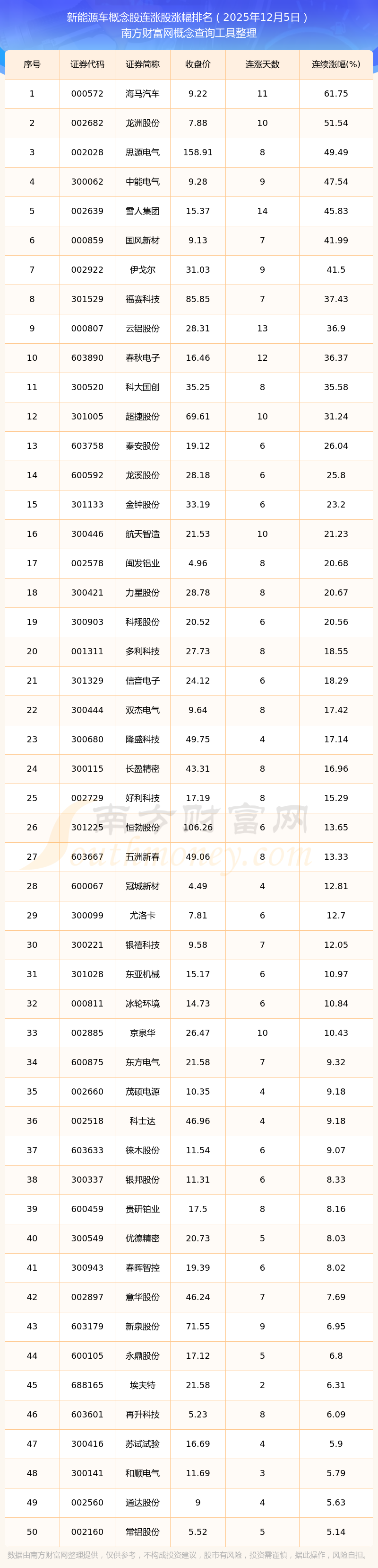 根据南方财富网概念查询工具数据统计,截止2025年12月5日收盘,新能源车概念股共有110只个股实现连涨。其中连续涨幅较大的个股有海马汽车、龙洲股份、思源电气等,连续涨幅分别为61.75%、51.54%、49.49%。