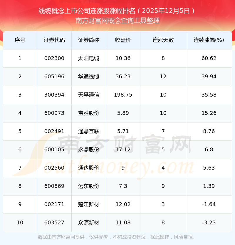 2025年12月5日线缆概念上市公司连涨股涨幅排名