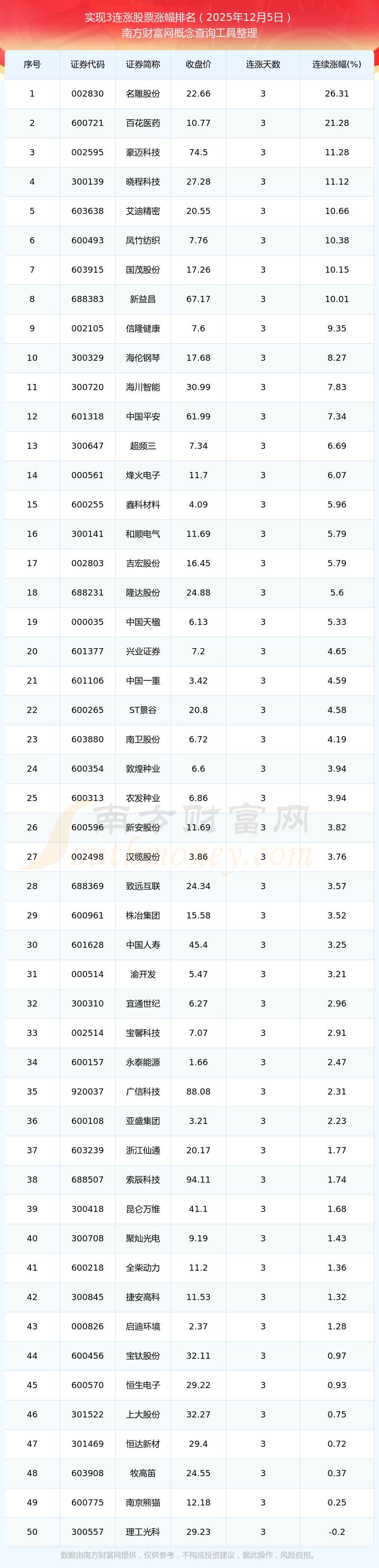 根据南方财富网概念查询工具数据统计,截止2025年12月5日收盘,共有100只个股实现3天连涨。其中连续涨幅较大的个股有名雕股份、百花医药、豪迈科技等,连续涨幅分别为26.31%、21.28%、11.28%。