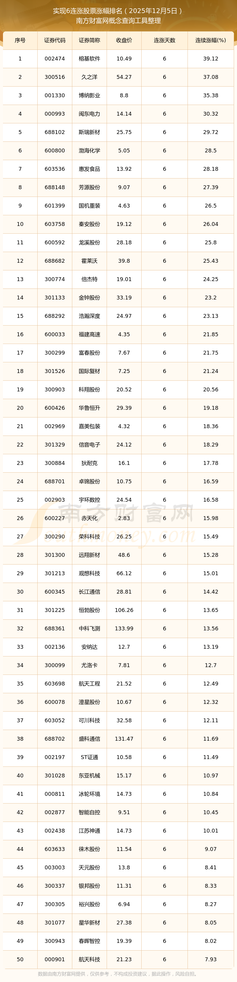 根据南方财富网概念查询工具数据统计,截止2025年12月5日收盘,共有106只个股实现6天连涨。其中连续涨幅较大的个股有榕基软件、久之洋、博纳影业等,连续涨幅分别为39.12%、37.08%、35.38%。