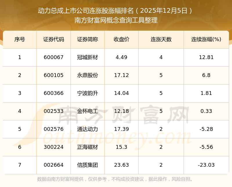 根据南方财富网概念查询工具数据统计,截止2025年12月5日收盘,动力总成上市公司共有7只个股实现连涨。其中连续涨幅较大的个股有冠城新材、永鼎股份、宁波韵升等,连续涨幅分别为12.81%、6.80%、1.81%。