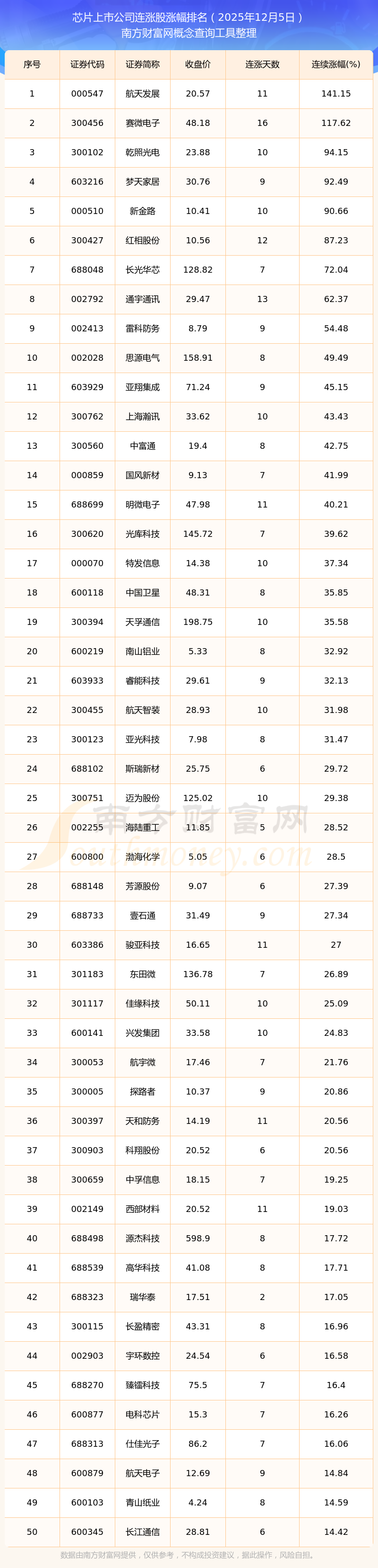 根据南方财富网概念查询工具数据统计,截止2025年12月5日收盘,芯片上市公司共有159只个股实现连涨。其中连续涨幅较大的个股有航天发展、赛微电子、乾照光电等,连续涨幅分别为141.15%、117.62%、94.15%。