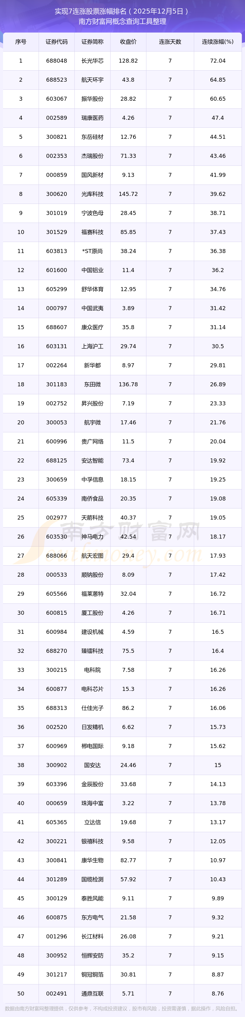 根据南方财富网概念查询工具数据统计,截止2025年12月5日收盘,共有86只个股实现7天连涨。其中连续涨幅较大的个股有长光华芯、航天环宇、振华股份等,连续涨幅分别为72.04%、64.85%、60.65%。