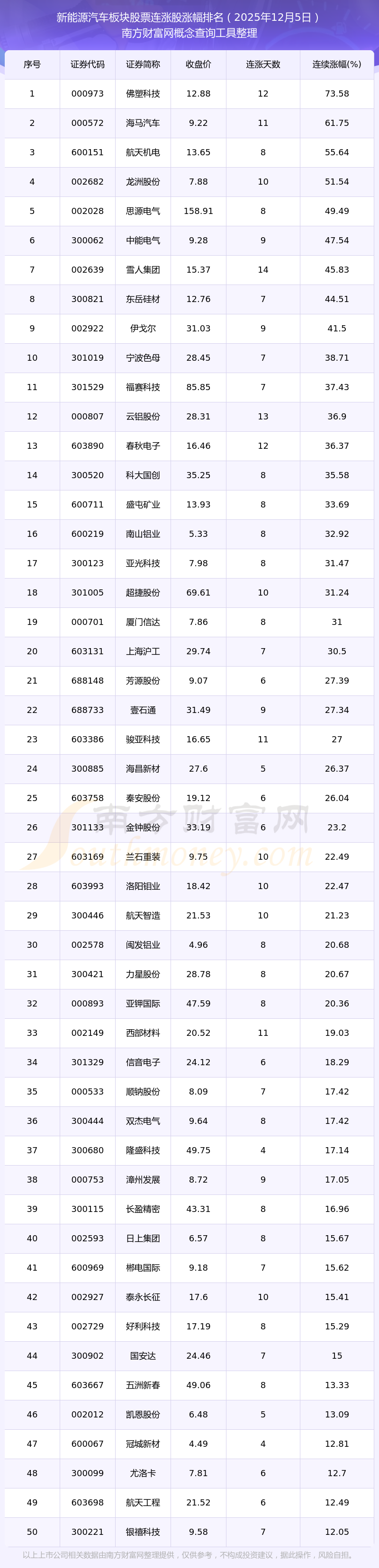 根据南方财富网概念查询工具数据统计,截止2025年12月5日收盘,新能源汽车板块股票共有160只个股实现连涨。其中连续涨幅较大的个股有佛塑科技、海马汽车、航天机电等,连续涨幅分别为73.58%、61.75%、55.64%。