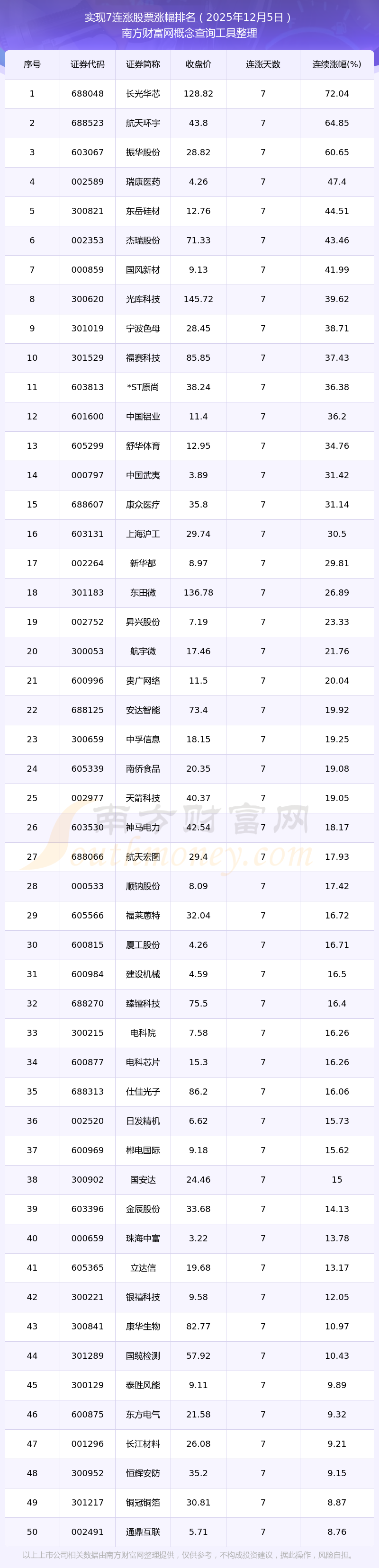 根据南方财富网概念查询工具数据统计,截止2025年12月5日收盘,共有86只个股实现7天连涨。其中连续涨幅较大的个股有长光华芯、航天环宇、振华股份等,连续涨幅分别为72.04%、64.85%、60.65%。
