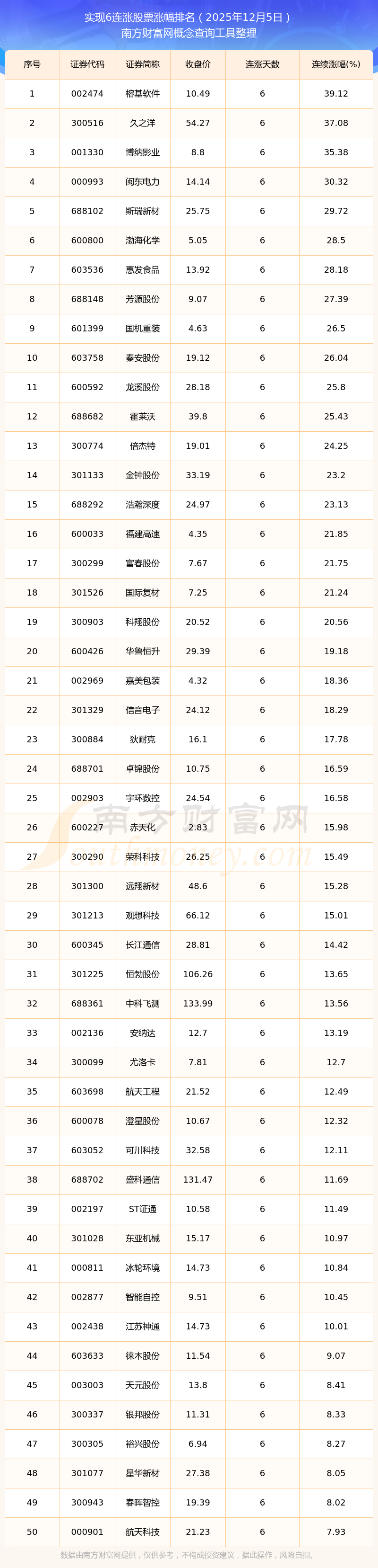 根据南方财富网概念查询工具数据统计,截止2025年12月5日收盘,共有106只个股实现6天连涨。其中连续涨幅较大的个股有榕基软件、久之洋、博纳影业等,连续涨幅分别为39.12%、37.08%、35.38%。
