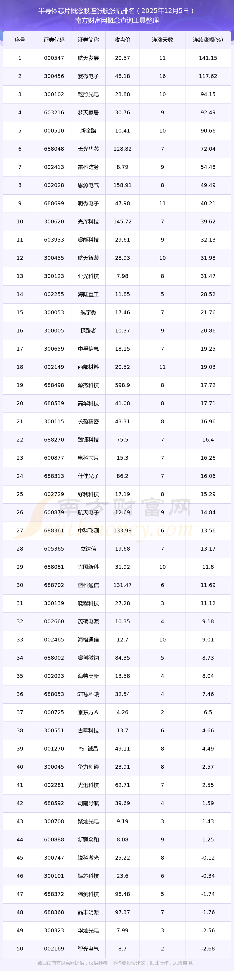 2025年12月5日半导体芯片概念股连涨股涨幅排名