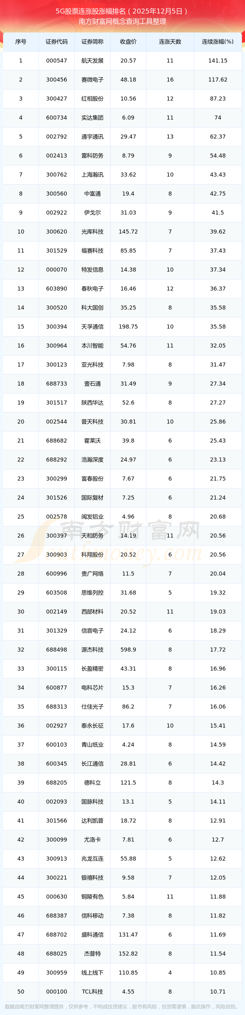 根据南方财富网概念查询工具数据统计,截止2025年12月5日收盘,5G股票共有119只个股实现连涨。其中连续涨幅较大的个股有航天发展、赛微电子、红相股份等,连续涨幅分别为141.15%、117.62%、87.23%。