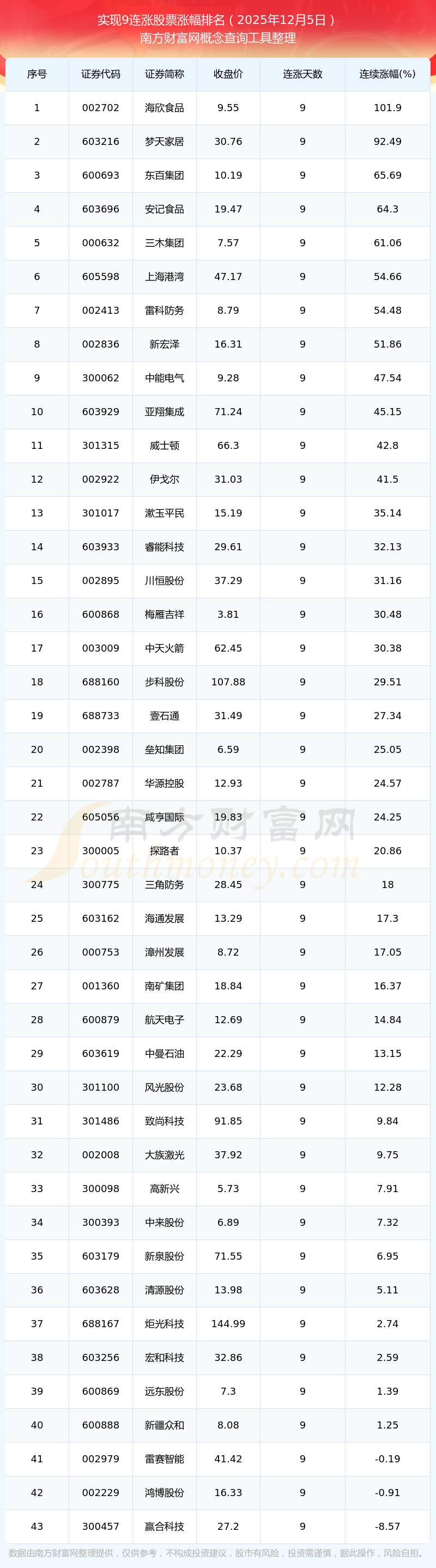 根据南方财富网概念查询工具数据统计,截止2025年12月5日收盘,共有43只个股实现9天连涨。其中连续涨幅较大的个股有海欣食品、梦天家居、东百集团等,连续涨幅分别为101.90%、92.49%、65.69%。
