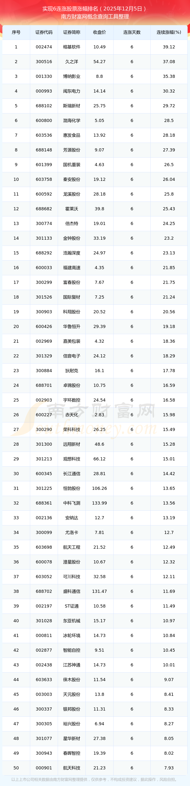 根据南方财富网概念查询工具数据统计,截止2025年12月5日收盘,共有106只个股实现6天连涨。其中连续涨幅较大的个股有榕基软件、久之洋、博纳影业等,连续涨幅分别为39.12%、37.08%、35.38%。