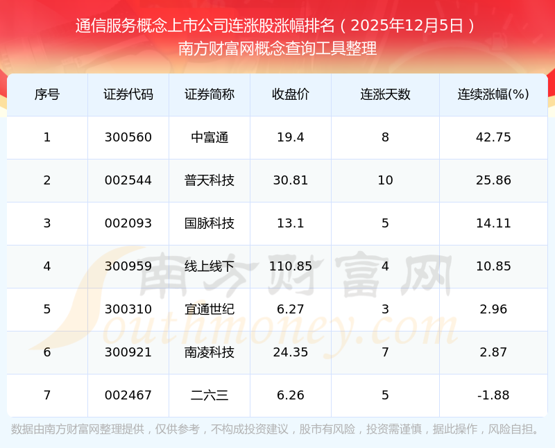 根据南方财富网概念查询工具数据统计,截止2025年12月5日收盘,通信服务概念上市公司共有7只个股实现连涨。其中连续涨幅较大的个股有中富通、普天科技、国脉科技等,连续涨幅分别为42.75%、25.86%、14.11%。