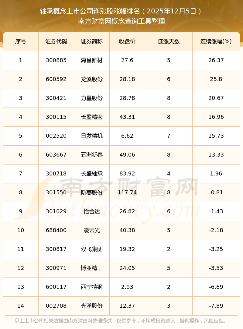 2025年12月5日轴承概念上市公司连涨股票涨幅排名