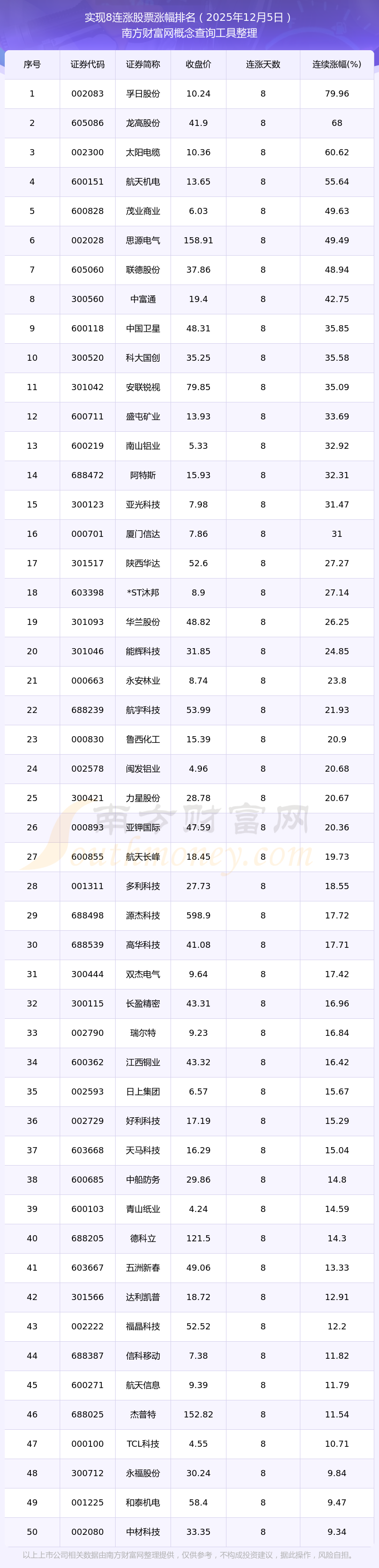 根据南方财富网概念查询工具数据统计,截止2025年12月5日收盘,共有75只个股实现8天连涨。其中连续涨幅较大的个股有孚日股份、龙高股份、太阳电缆等,连续涨幅分别为79.96%、68.00%、60.62%。