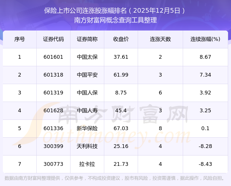 根据南方财富网概念查询工具数据统计,截止2025年12月5日收盘,保险上市公司共有7只个股实现连涨。其中连续涨幅较大的个股有中国太保、中国平安、中国人保等,连续涨幅分别为8.67%、7.34%、3.92%。