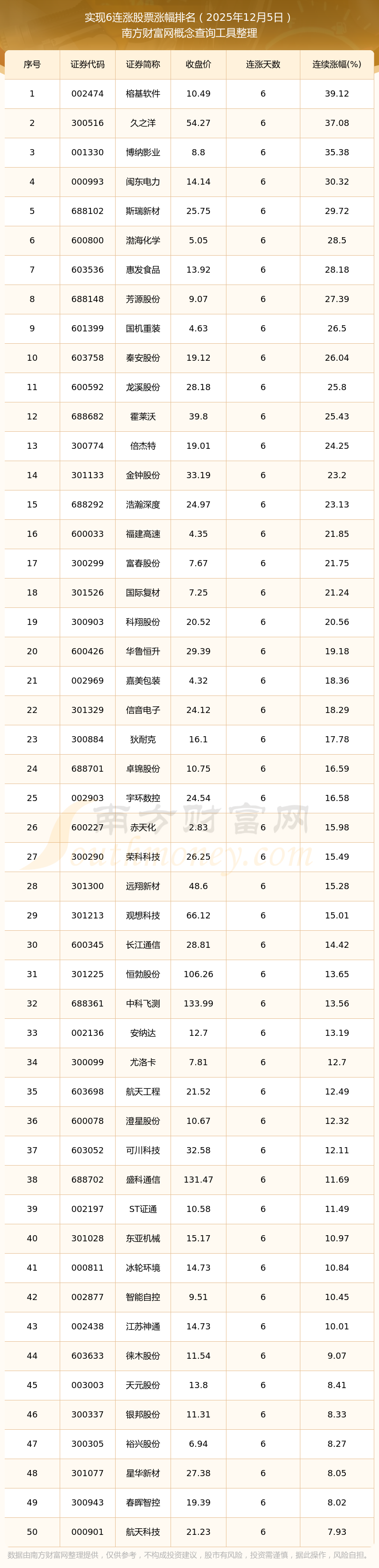 根据南方财富网概念查询工具数据统计,截止2025年12月5日收盘,共有106只个股实现6天连涨。其中连续涨幅较大的个股有榕基软件、久之洋、博纳影业等,连续涨幅分别为39.12%、37.08%、35.38%。