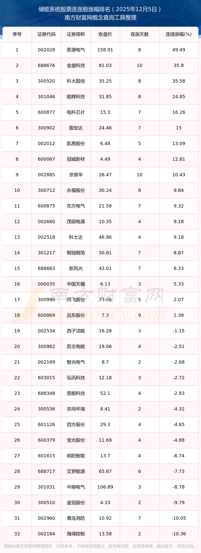根据南方财富网概念查询工具数据统计,截止2025年12月5日收盘,储能系统股票共有32只个股实现连涨。其中连续涨幅较大的个股有思源电气、金盘科技、科大国创等,连续涨幅分别为49.49%、35.80%、35.58%。