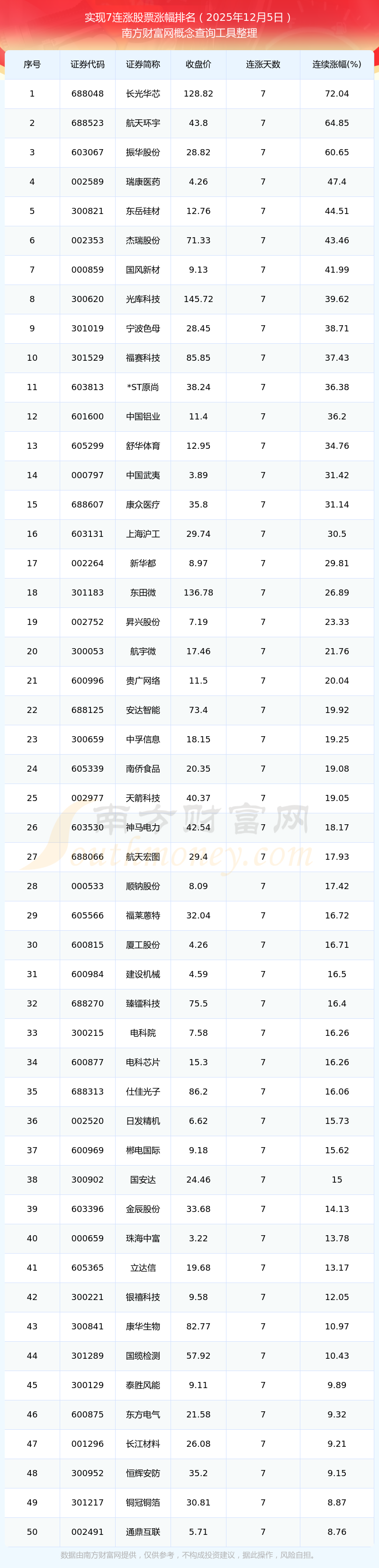2025年12月5日实现7连涨股票涨幅排名