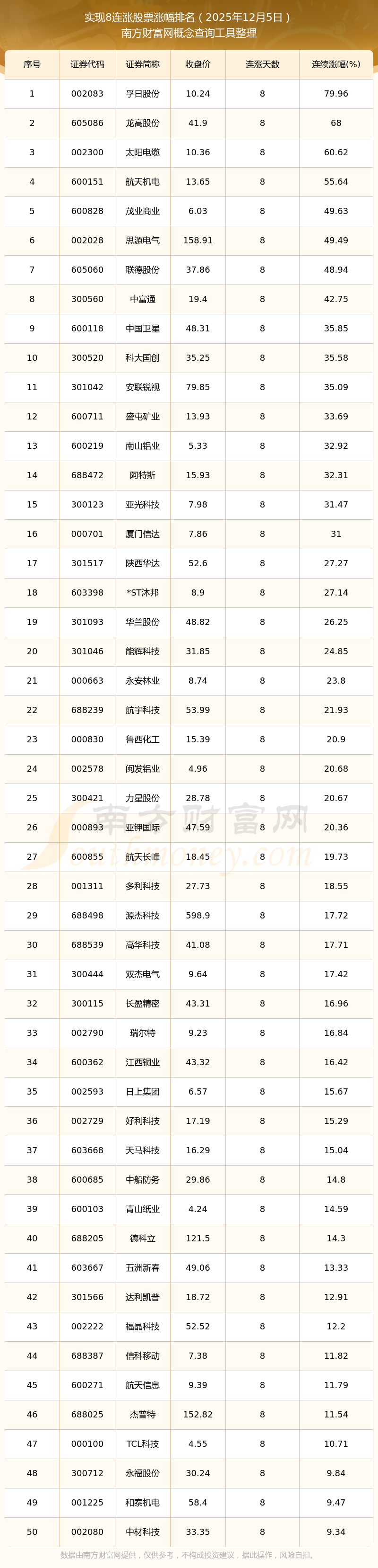 根据南方财富网概念查询工具数据统计,截止2025年12月5日收盘,共有75只个股实现8天连涨。其中连续涨幅较大的个股有孚日股份、龙高股份、太阳电缆等,连续涨幅分别为79.96%、68.00%、60.62%。