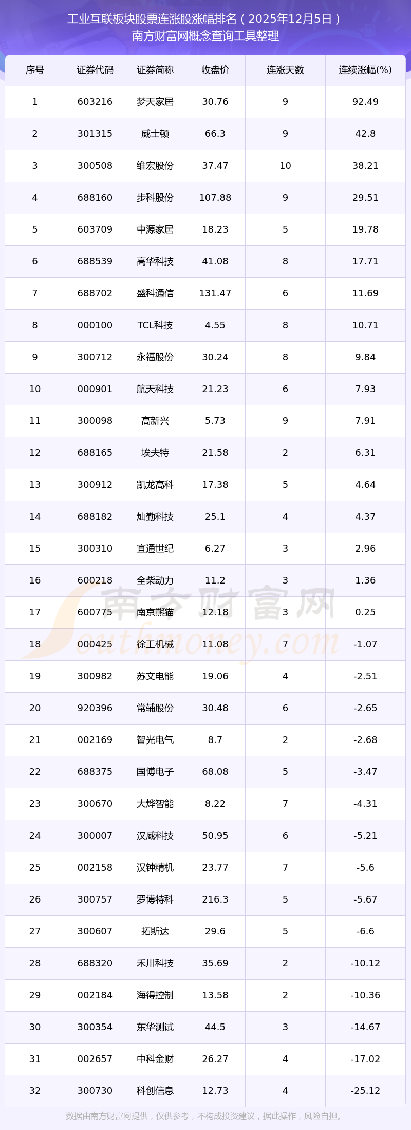 根据南方财富网概念查询工具数据统计,截止2025年12月5日收盘,工业互联板块股票共有32只个股实现连涨。其中连续涨幅较大的个股有梦天家居、威士顿、维宏股份等,连续涨幅分别为92.49%、42.80%、38.21%。