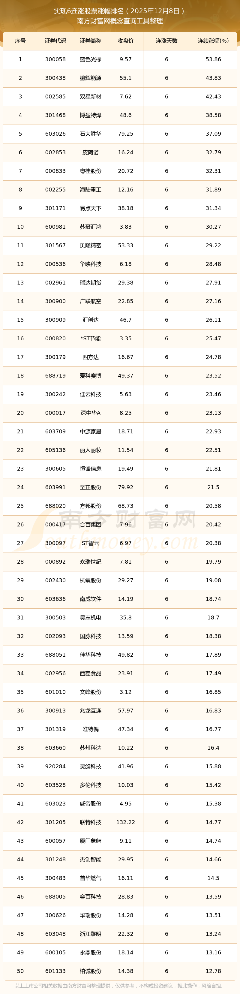 2025年12月8日实现6连涨股票涨幅排名