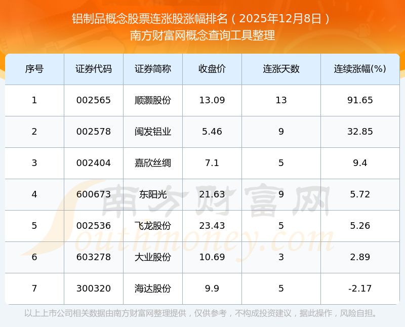 根据南方财富网概念查询工具数据统计,截止2025年12月8日收盘,铝制品概念股票共有7只个股实现连涨。其中连续涨幅较大的个股有顺灏股份、闽发铝业、嘉欣丝绸等,连续涨幅分别为91.65%、32.85%、9.40%。