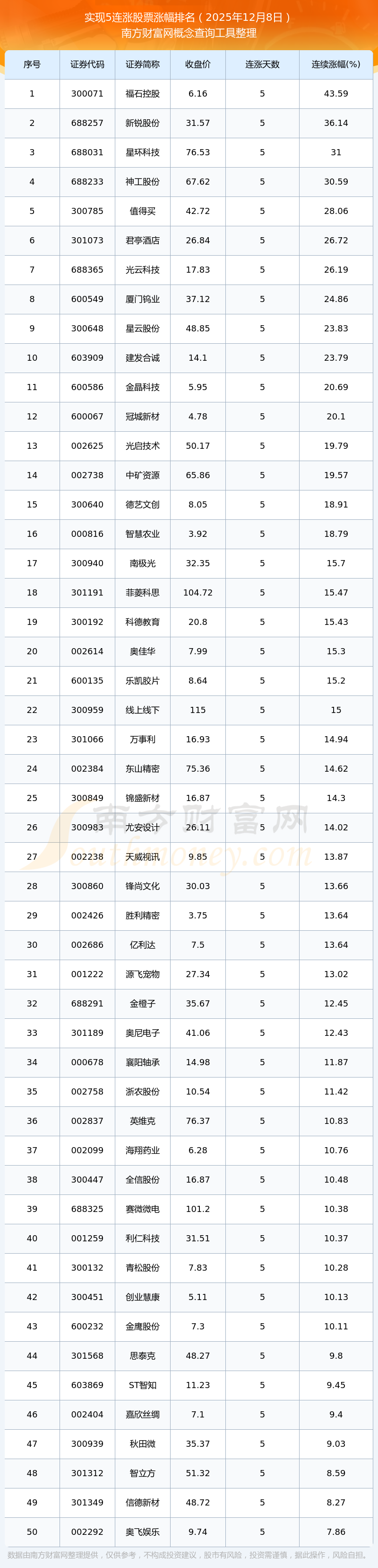 根据南方财富网概念查询工具数据统计,截止2025年12月8日收盘,共有168只个股实现5天连涨。其中连续涨幅较大的个股有福石控股、新锐股份、星环科技等,连续涨幅分别为43.59%、36.14%、31.00%。