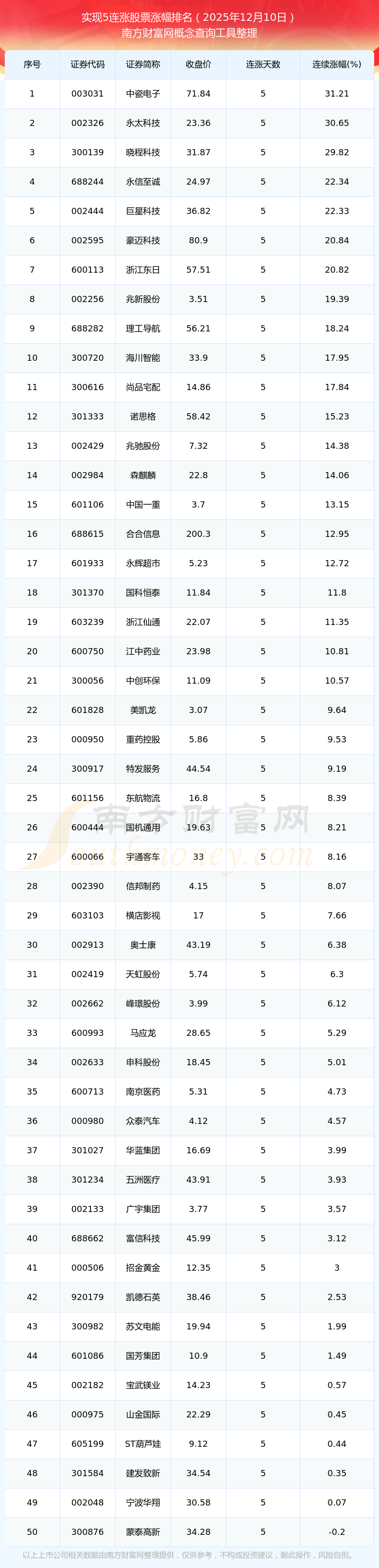 根据南方财富网概念查询工具数据统计,截止2025年12月10日收盘,共有81只个股实现5天连涨。其中连续涨幅较大的个股有中瓷电子、永太科技、晓程科技等,连续涨幅分别为31.21%、30.65%、29.82%。