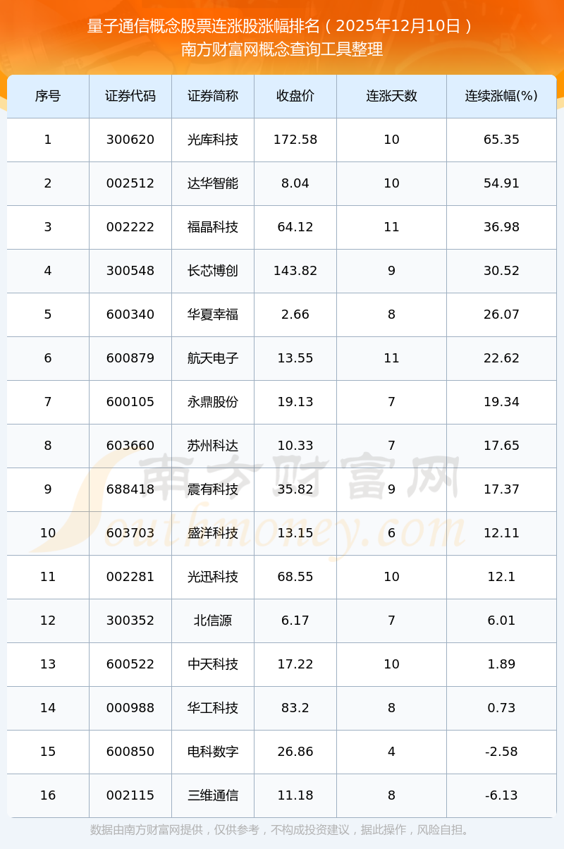 2025年12月10日量子通信概念股票连涨股涨幅排名