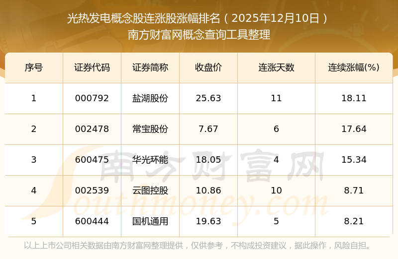 2025年12月10日光热发电概念股连涨股涨幅排名