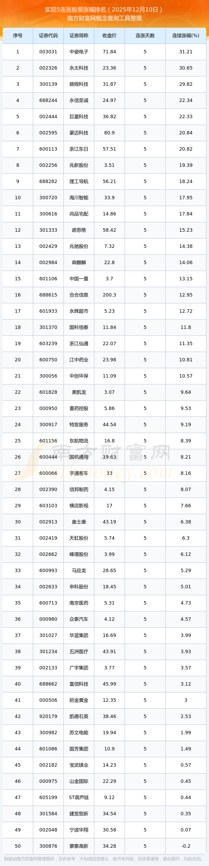 根据南方财富网概念查询工具数据统计,截止2025年12月10日收盘,共有81只个股实现5天连涨。其中连续涨幅较大的个股有中瓷电子、永太科技、晓程科技等,连续涨幅分别为31.21%、30.65%、29.82%。