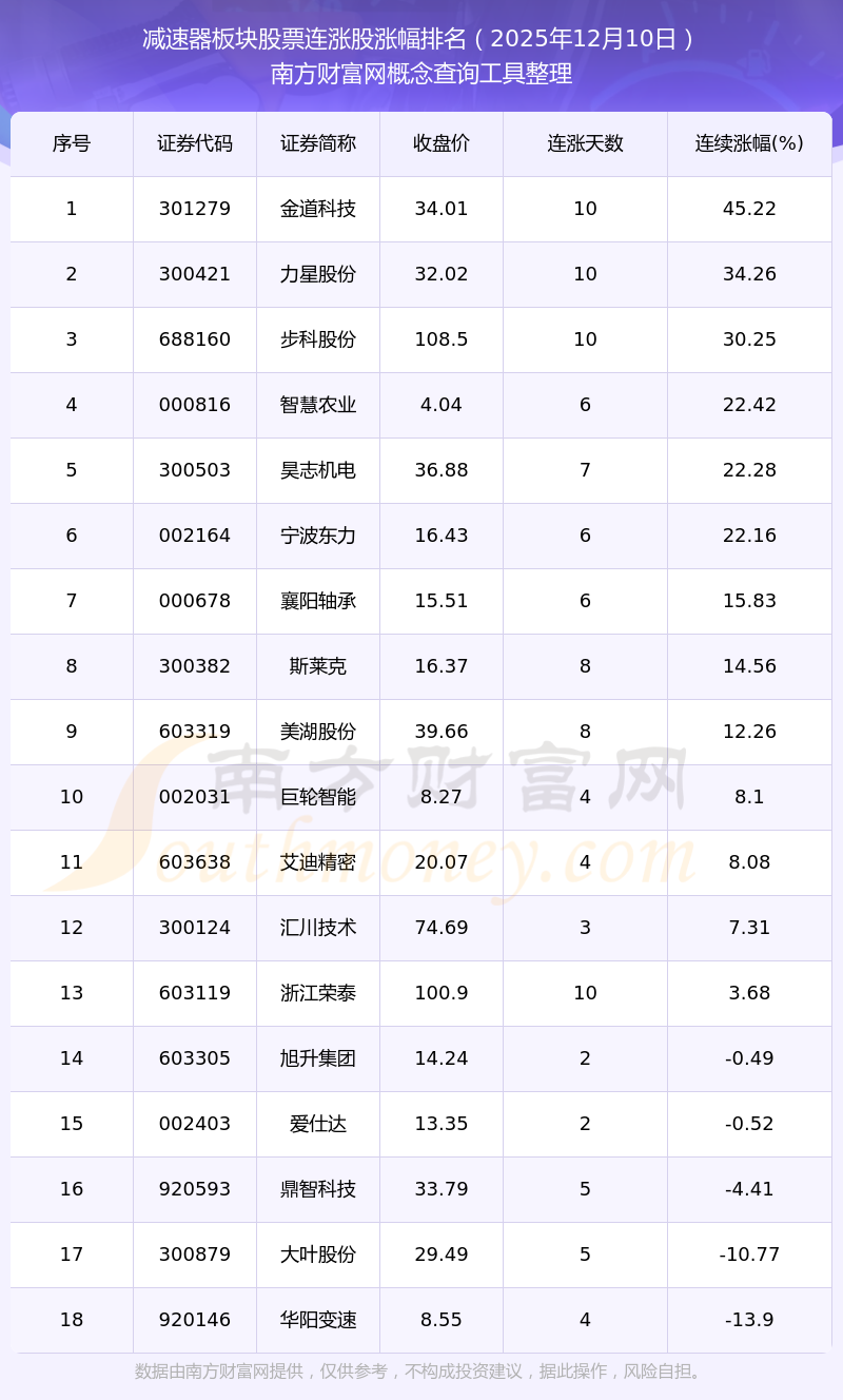2025年12月10日减速器板块股票连涨股票涨幅排名
