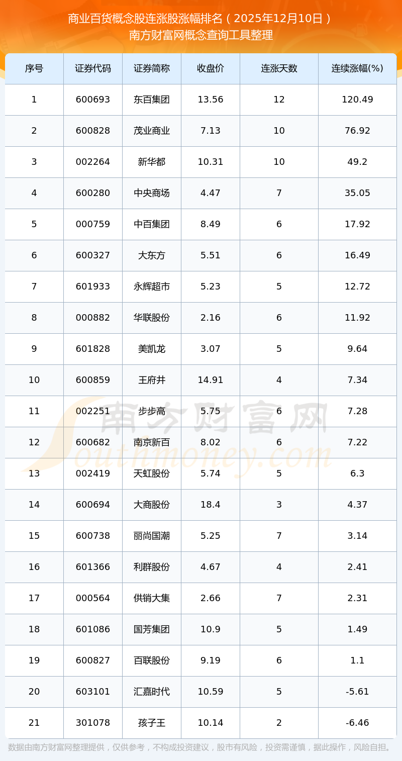 根据南方财富网概念查询工具数据统计,截止2025年12月10日收盘,商业百货概念股共有21只个股实现连涨。其中连续涨幅较大的个股有东百集团、茂业商业、新华都等,连续涨幅分别为120.49%、76.92%、49.20%。